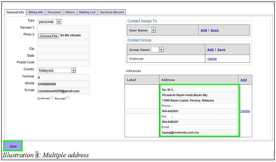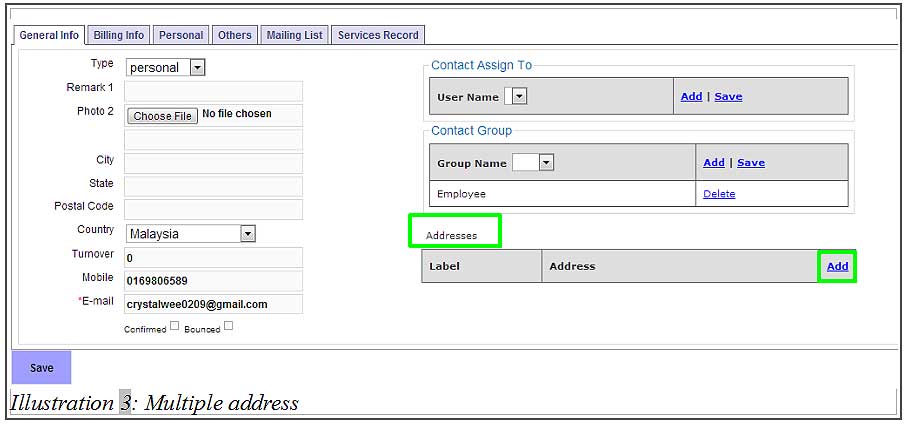 3. Now, you are able to add in the address in Addresses. Click on Add when you want to add an address. After adding, click Save to update the contact’s detail.