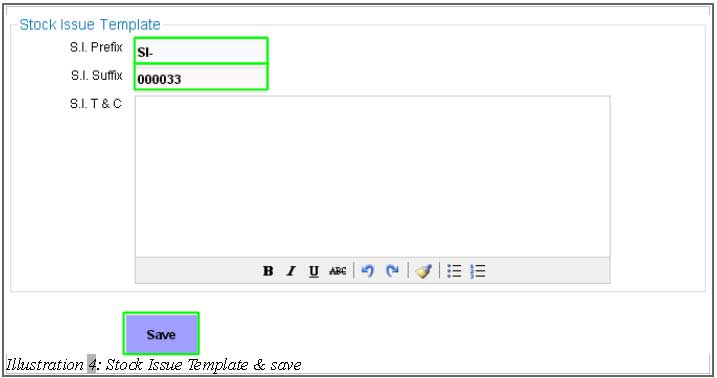 4. Go to “Stock Issue Template”. You can change the “S. I. Prefix”, “S. I. Suffix” and “S. I. T&C” which is Terms and Conditions. We advise you to leave it default as well. Lastly click on “Save” button to save.